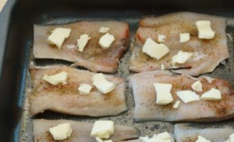 Leg met een mes gesneden plakjes boter in stukjes vis.