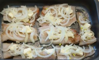 Leg halve uienringen op de olie. Het is belangrijk om de ui gelijkmatig te verdelen. Samen met uien kun je stukjes gekookt ei over de vis verdelen. Het wordt aanbevolen om voor te raspen op een grove rasp. Maar je kunt deze stap overslaan en het ei gebruiken bij het serveren.