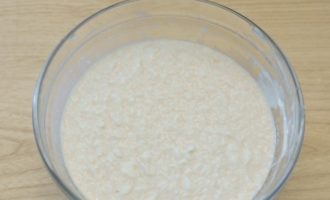 - De eerste stap is het bereiden van het gistbeslag. Hiervoor in 200 ml. Los 5 g droge gist op in warm gekookt water, voeg een snufje suiker toe. Bereik volledige oplossing van gist en suiker en voeg vervolgens rijstvlokken toe. Voor een dikker beslag kun je een lepel bloem toevoegen. Als je bloem gebruikt in plaats van vlokken, neem dan gewoon 100 g. Roer alles tot een deeg, dek af met folie en zet 30-40 minuten op een warme plaats.