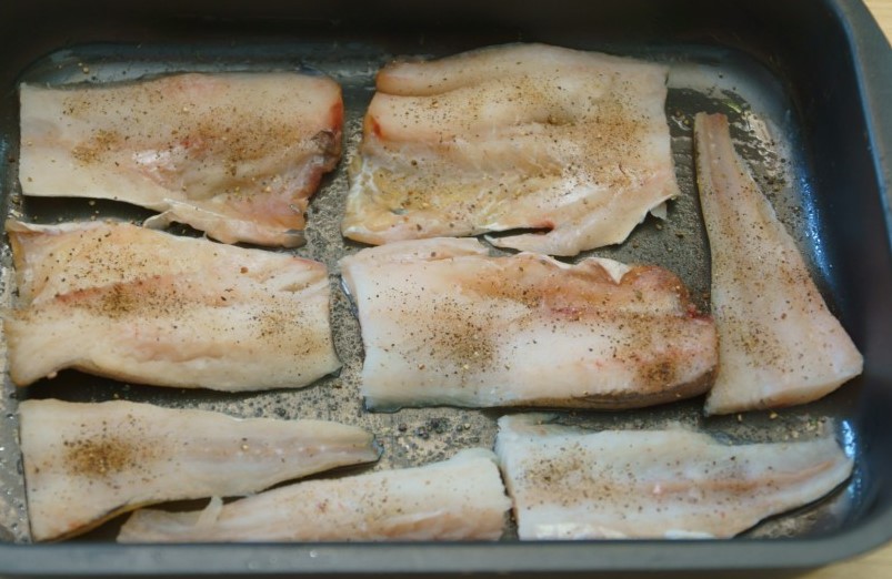 - Leg de in bloem gepaneerde vis in een ingevette schaal of een ovenvaste braadpan.