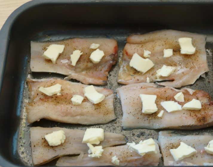 Leg met een mes gesneden plakjes boter in stukjes vis.