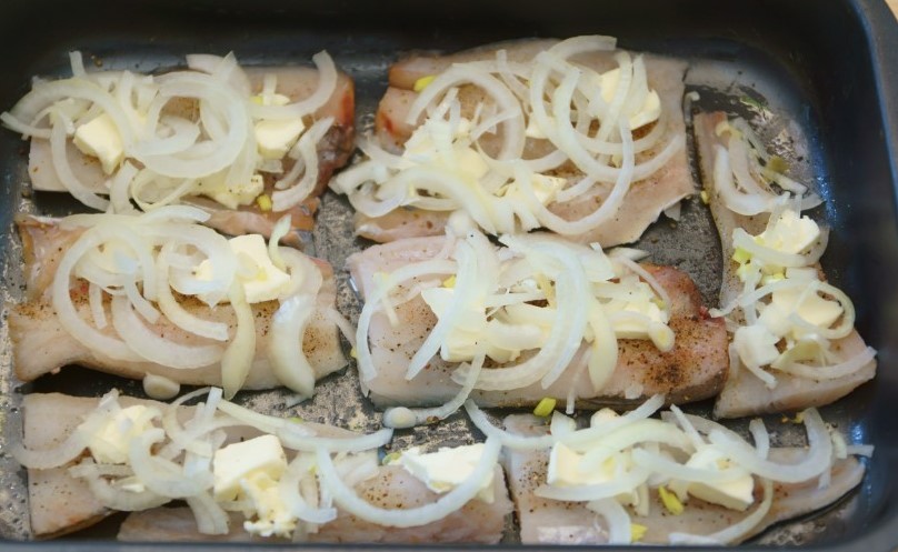 - Stapsgewijs recept voor het koken van koolvisfilet met uien in de oven