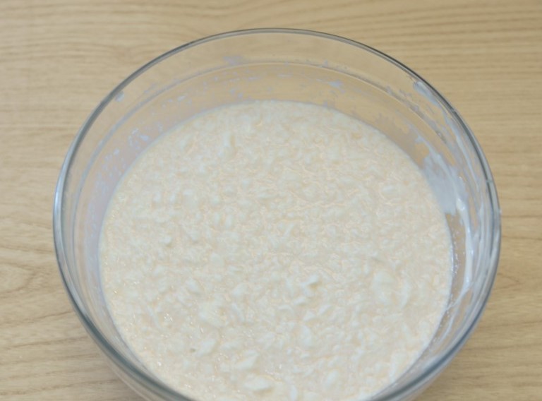 - De eerste stap is het bereiden van het gistbeslag. Hiervoor in 200 ml. Los 5 g droge gist op in warm gekookt water, voeg een snufje suiker toe. Bereik volledige oplossing van gist en suiker en voeg vervolgens rijstvlokken toe. Voor een dikker beslag kun je een lepel bloem toevoegen. Als je bloem gebruikt in plaats van vlokken, neem dan gewoon 100 g. Roer alles tot een deeg, dek af met folie en zet 30-40 minuten op een warme plaats.