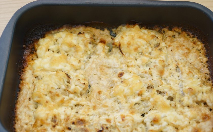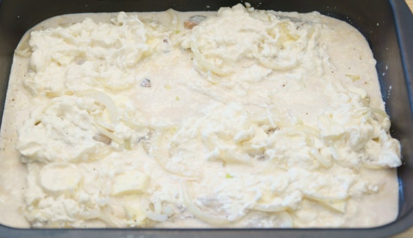 - Schep het in volume gegroeide beslag op stukjes vis en uien en verdeel het gelijkmatig over het oppervlak. Laat de vis 5-7 minuten met het deeg staan en stuur hem dan naar de oven.