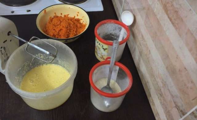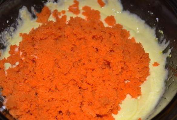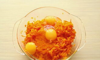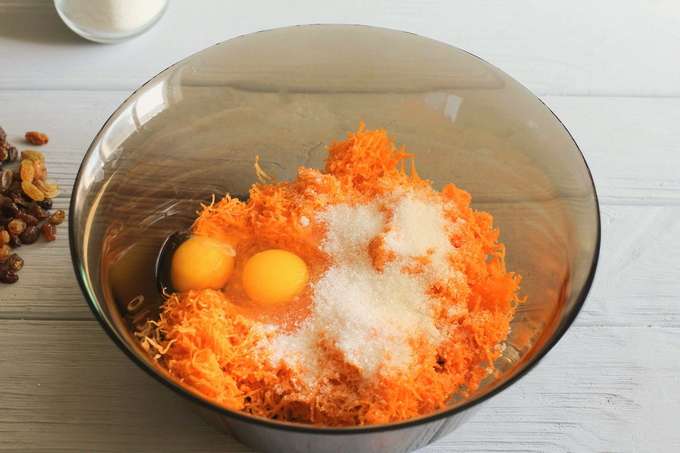 - Voeg kippeneieren en suiker toe aan de wortelen. Meng de ingrediënten grondig tot een glad mengsel.