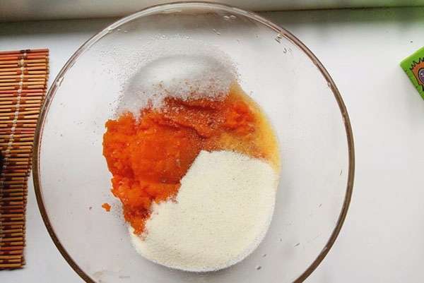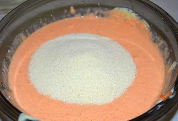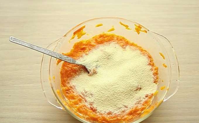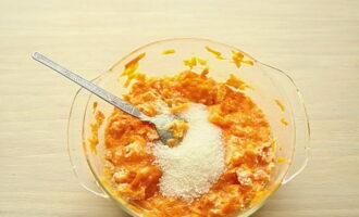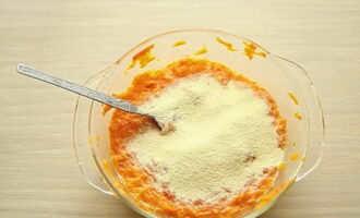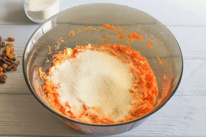 - Voeg het ei, het griesmeel en de suiker toe aan de wortelmassa. Roer de inhoud goed door.