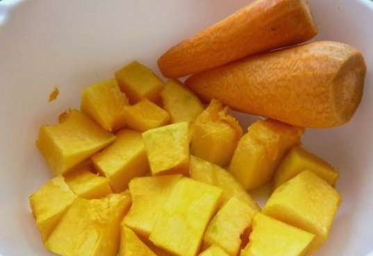 - We maken de wortels schoon en spoelen ze af. We verwijderen ook de schil van de pompoen, snijden het resterende product in grote blokjes.