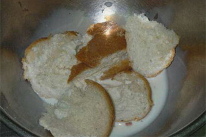 - Doe het witbrood in een diepe kom en vul deze even met melk. Er kan een oud of droog product worden gebruikt.