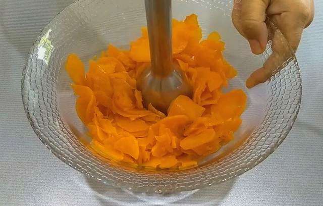 - We maken de wortels schoon en snijden ze in dunne plakjes. We sturen de groente in een pan, vullen deze met water en laten sudderen tot het product zacht wordt.