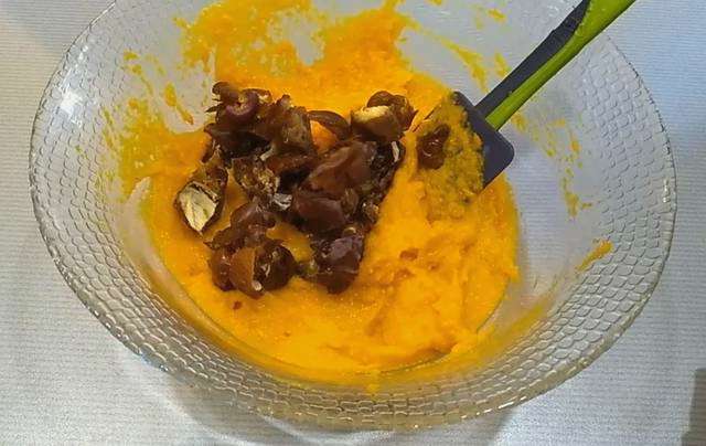 - Voeg het gedroogde fruit toe aan het pompoen-wortelmengsel en giet het in een ovenschaal.