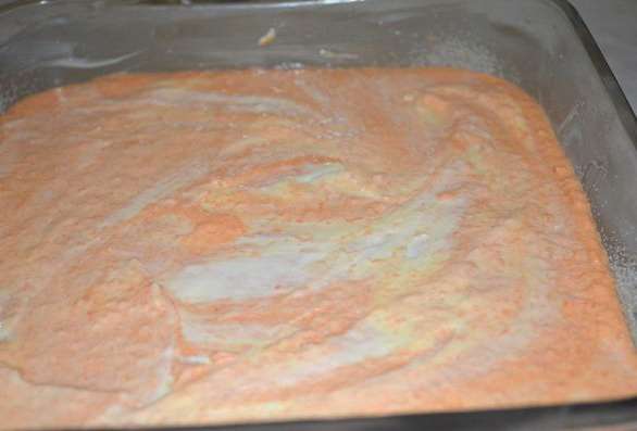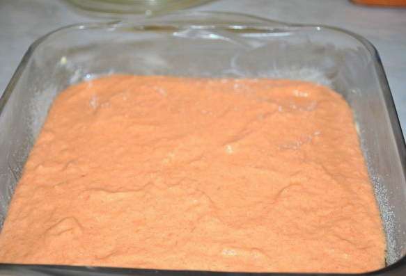 - Giet de wrongel-wortelmassa in een ovenschaal.