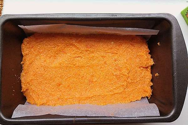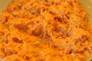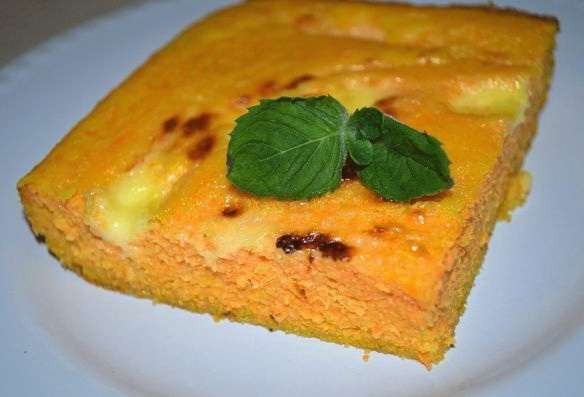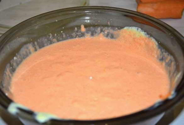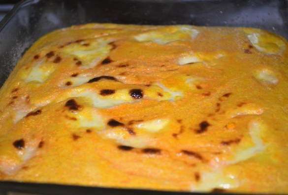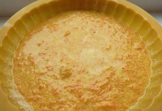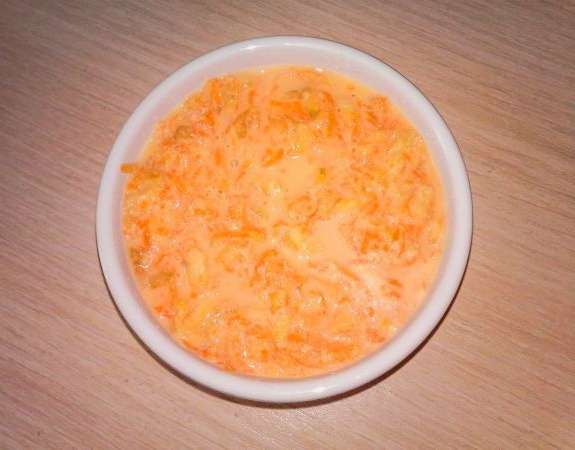 - Doe de pap van het brood bij het wortelmengsel, roer tot een gladde massa en doe in een ovenschaal. Bak 35 minuten in de oven op 180 graden.