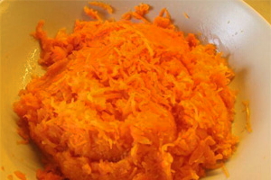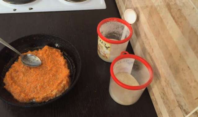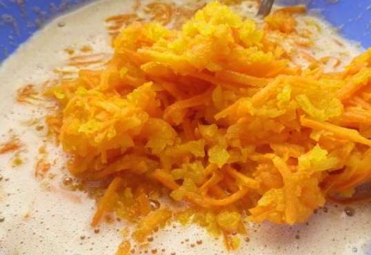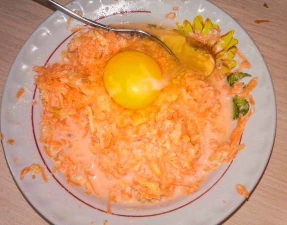 - Wrijf de geschilde wortelen op een middelgrote rasp. Meng het met suiker en een ei, roer dan goed door.