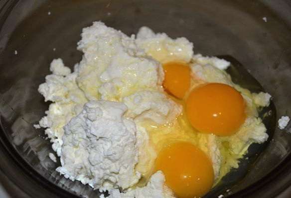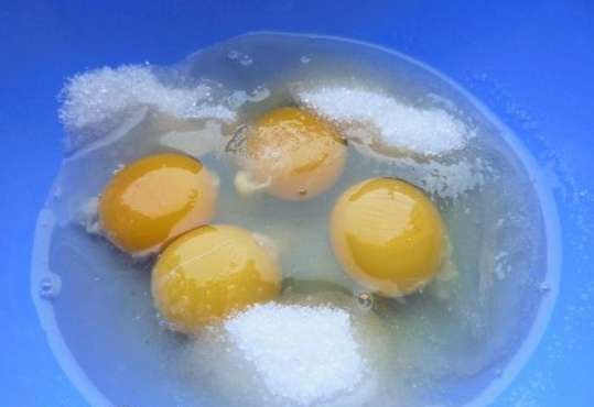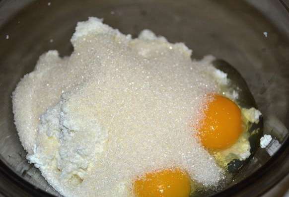 - Voeg suiker toe aan eieren en kwark. We malen de producten.