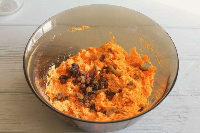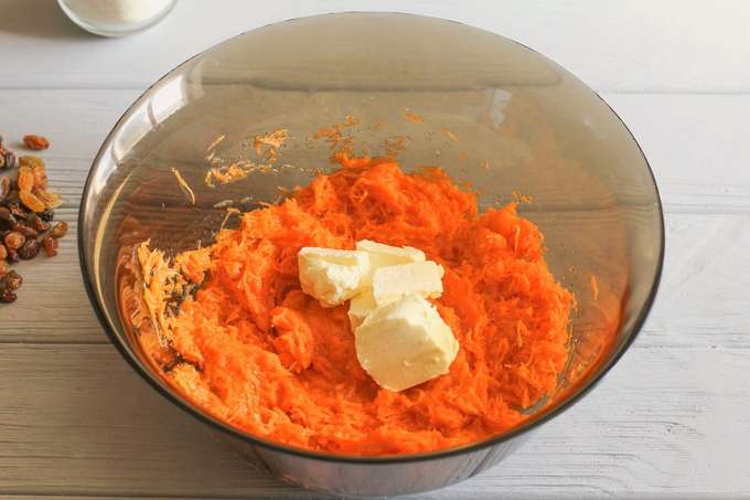 - Bestrijk de ovenschaal met plantaardige olie. Giet hier het wortelmengsel met rozijnen. We bakken het gerecht 25 minuten in een op 180 graden voorverwarmde oven.