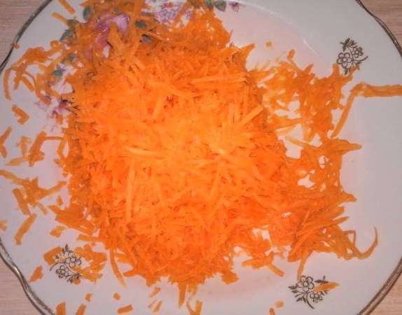 - We reinigen en wassen de wortels, wrijven op een grove rasp en bakken ongeveer 3-5 minuten in een pan met plantaardige olie. We sturen het ingrediënt in een diepe kom.