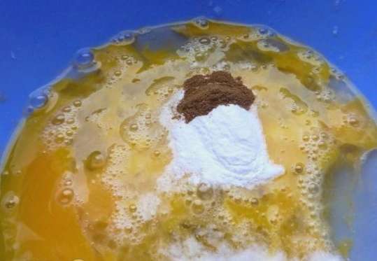 - Voeg hier vanilline, kaneel en bakpoeder aan toe. Meng de ingrediënten.