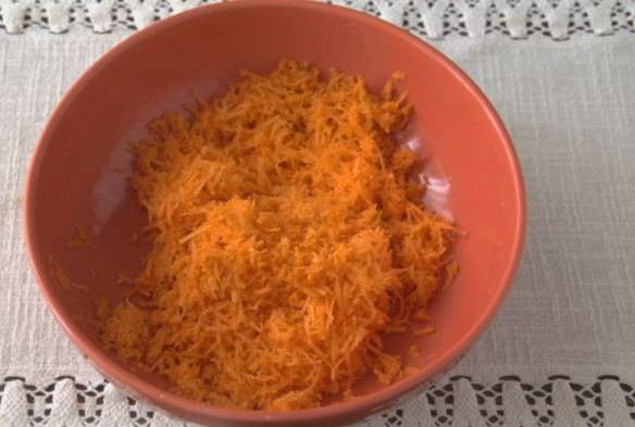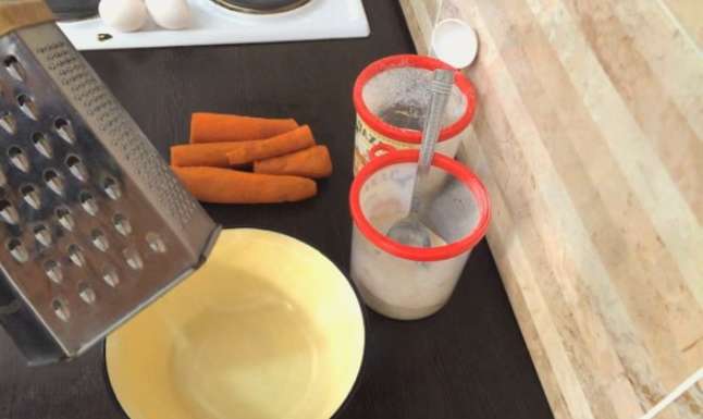 - Hetzelfde doen we met wortelen: we maken schoon en wrijven. Voor een groente is het beter om een fijne rasp te gebruiken.