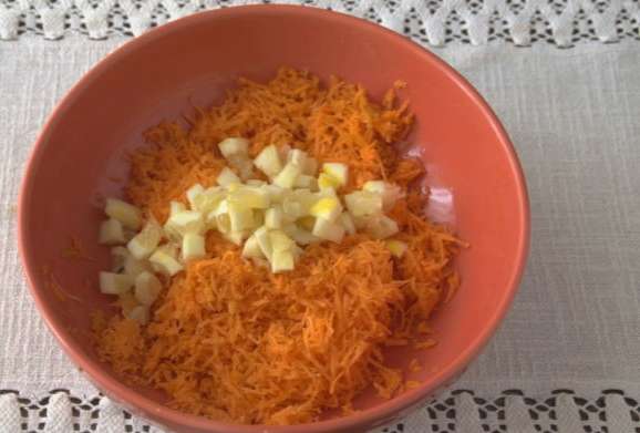 - Meng geraspte appels met wortelen en breek er een ei voor.