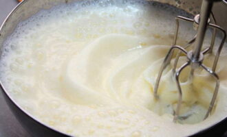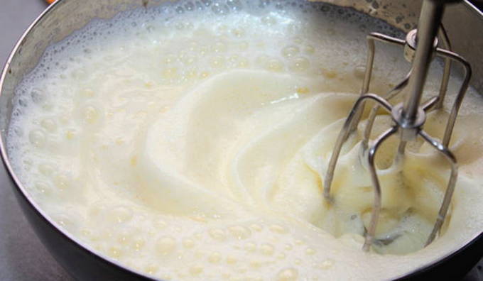 - Klop de afgekoelde room met een mixer tot een stabiele massa, voeg porties toe aan het chocolade-melkmengsel.