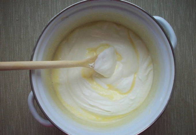 - Klop de dooiers lichtjes, giet ze in de verwarmde room in een dunne stroom, onder voortdurend roeren. Het is belangrijk om dit langzaam te doen, zodat de dooiers niet opkrullen. Verwarm de massa op laag vuur, zonder te koken gedurende ongeveer 7 minuten, zodat het dikker wordt, haal het dan van het fornuis en laat afkoelen.