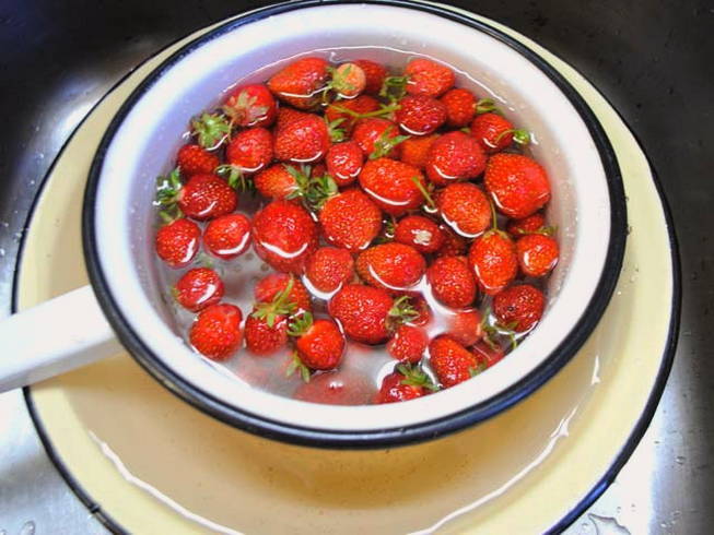 - Spoel verse aardbeien, ontdooi vers ingevroren aardbeien op kamertemperatuur.