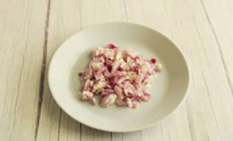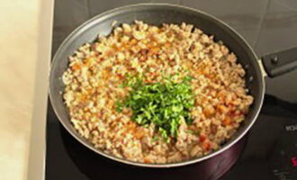 - Schil de uien, hak ze fijn en bak ze in plantaardige olie. Voeg vervolgens het gehakt toe, bak 5-7 minuten, zout en breng op smaak.