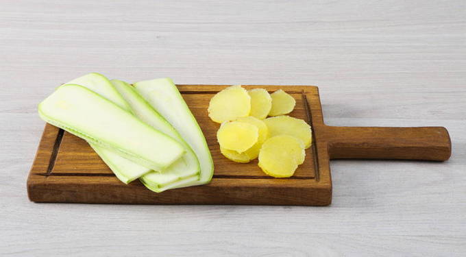 - Was de courgette, snij in dunne reepjes.Snijd de aardappelen in plakjes.