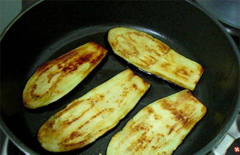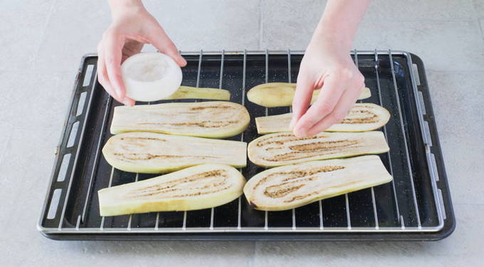 Was de aubergines, snijd ze in plakjes, zout en laat 20 minuten staan. Bak vervolgens de aubergines aan beide kanten in plantaardige olie.