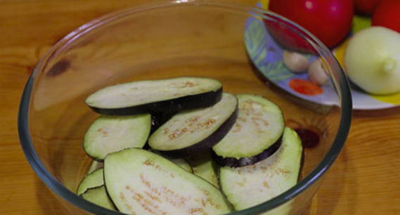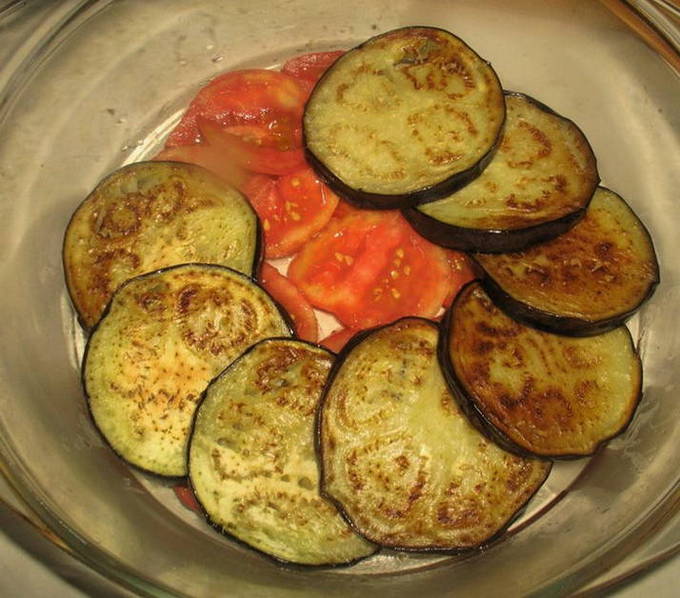 - Was de aubergines, snijd ze in plakjes en bak ze in plantaardige olie. Verbrand de tomaten met kokend water, verwijder het vel en snijd ze in dunne plakjes.