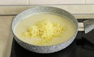 - Smelt de boter in een andere pan, voeg bloem toe, bak goudbruin. Giet vervolgens geleidelijk de melk erbij en roer de saus tot een gladde massa. Voeg dan de geraspte kaas toe.