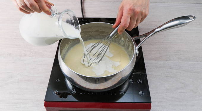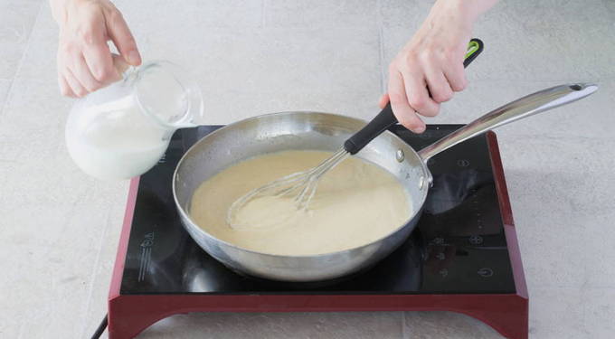 - Bereid de saus voor. Smelt de boter in een pan, voeg bloem toe en bak goudbruin. Giet vervolgens geleidelijk de melk erbij, roer de massa continu met een garde zodat er geen klontjes ontstaan. Laat sudderen tot het dik is en haal dan de pan van het vuur.