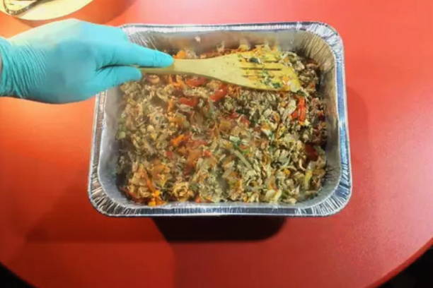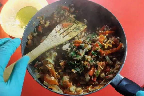 - Bak uien, paprika en wortelen in plantaardige olie, bak ze 10 minuten en voeg dan kip en tomaten toe. Voeg na nog eens 10 minuten wijn toe, dek de pan af met een deksel en laat 15 minuten sudderen.