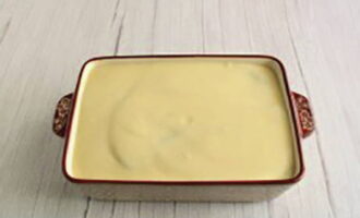 - Bereid de saus voor. Smelt boter in een koekenpan, bak bloem erin, giet warme melk erbij en kook tot het ingedikt is, zout naar smaak. Giet de saus over het werkstuk.