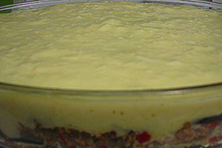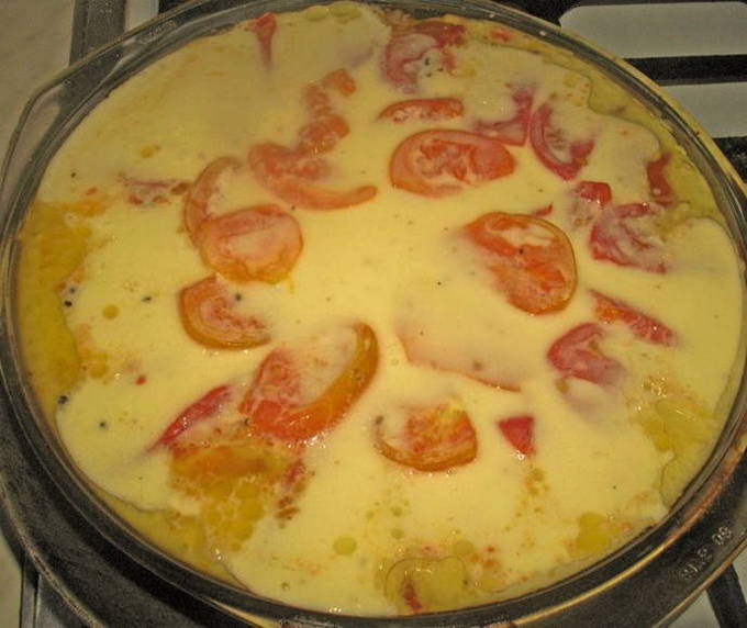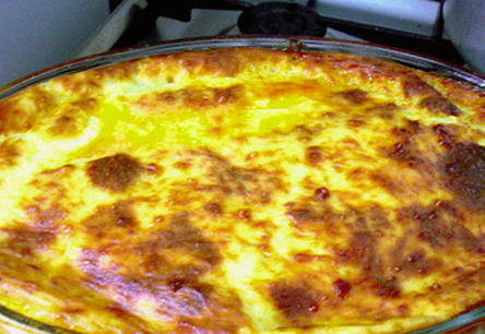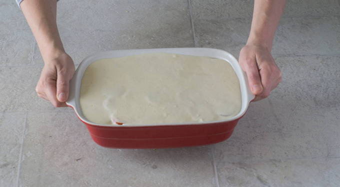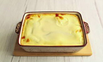 - Klop eieren met bloem. Voeg geleidelijk melk toe, roer tot een gladde massa. Giet de saus over de moussaka en zet deze 10 minuten terug in de oven, maar zonder deksel.