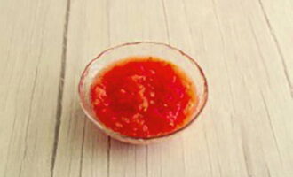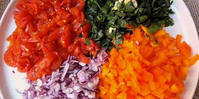 - Hak paprika, tomaten, uien, knoflook en kruiden fijn. Doe ui, peper en knoflook in een voorverwarmde pan, bak 3 minuten. Voeg vervolgens een paar eetlepels tomatenpuree toe en kook nog 3-5 minuten. Voeg dan de tomaten en kaneel toe en kook nog 5 minuten.