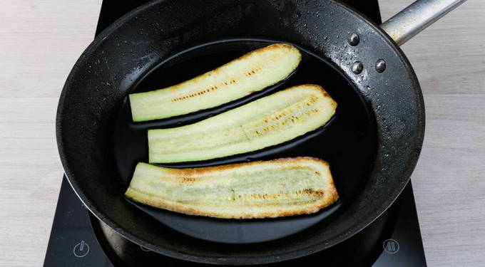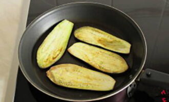 - Was de courgette en aubergine en snij in dunne reepjes. Bak ze aan beide kanten goudbruin in plantaardige olie.