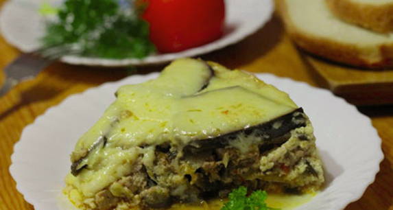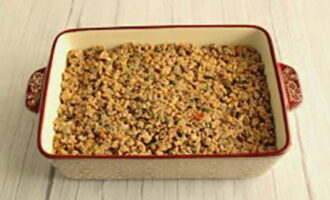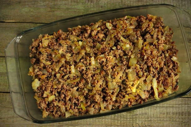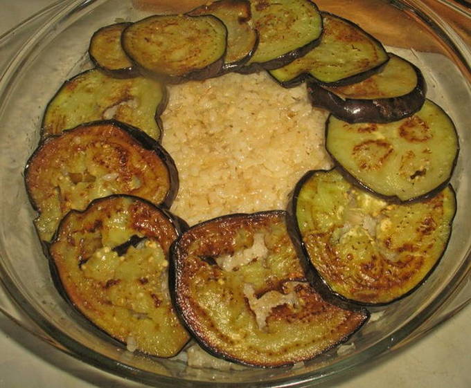 - Bak het gehakt in plantaardige olie samen met uien, zout en breng op smaak. Leg de vleeslaag op de aubergine.
