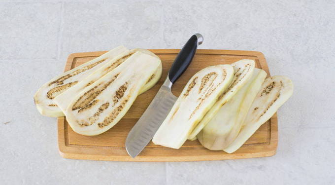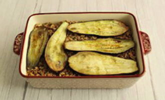Leg vervolgens een laag van de helft van de gebakken aubergine.