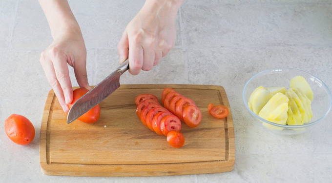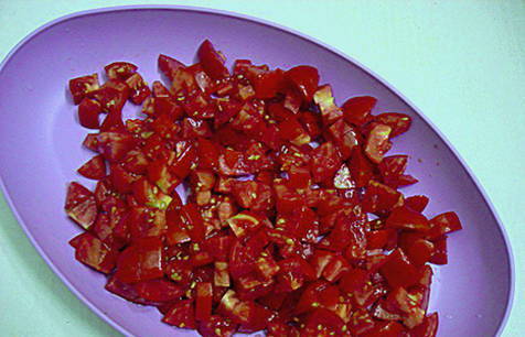 - Was de tomaten en snij in blokjes.