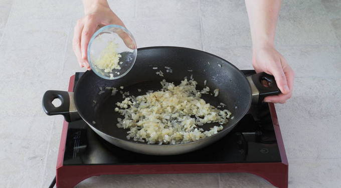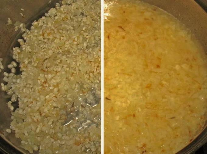 - Als de ui transparant wordt, voeg je de rijst toe, bak je deze lichtjes, giet je er anderhalve kop heet water en zout naar smaak bij. Kook tot de rijst al het water heeft opgenomen.