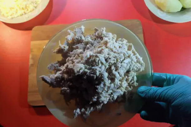 - Kook de kipfilet in gezouten water, koel af en snij in kleine blokjes.