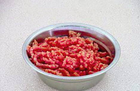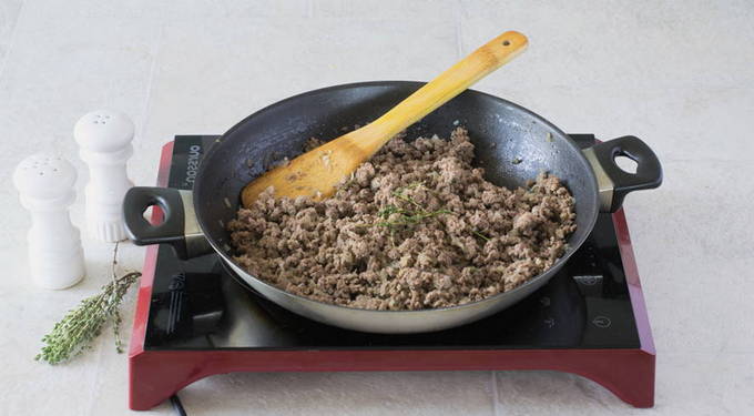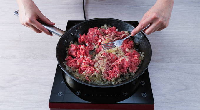 - Bak het gehakt 5 minuten in een koekenpan, voeg dan de uien toe en bak nog 10 minuten onder voortdurend roeren.