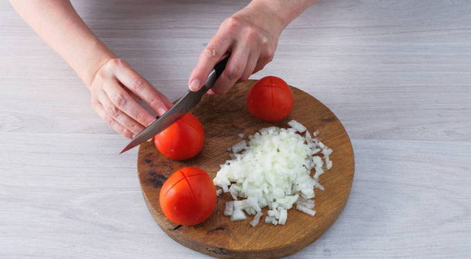 - Pel de ui en hak fijn. Was de tomaten, maak er kruisvormige sneden in, dompel ze een paar minuten in kokend water. Schil vervolgens, verwijder de zaadjes en hak het vruchtvlees fijn.