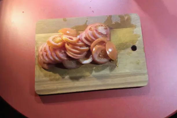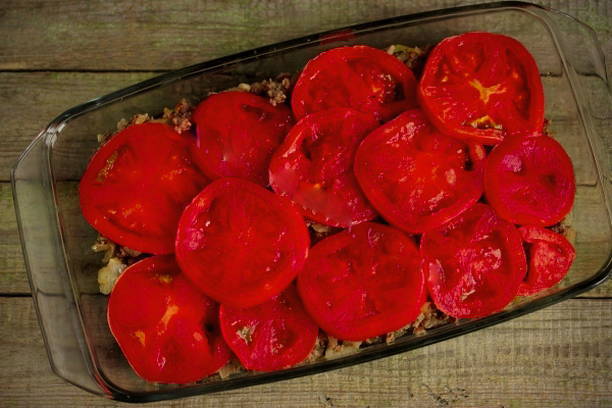 - Snijd de tomaten in dunne plakjes en leg ze op het gehakt.