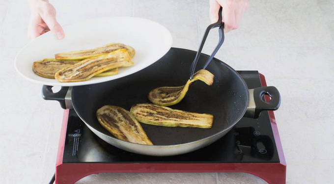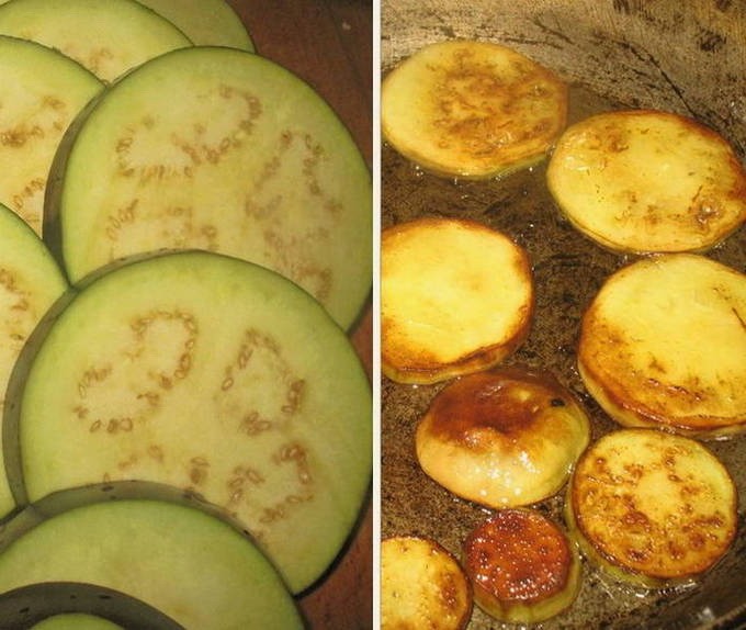 - Was de aubergines, snijd ze in plakjes, doe ze in een kom en bestrooi ze met zout. Laat de groenten 10 minuten staan, spoel ze af en bak ze aan beide kanten in plantaardige olie.