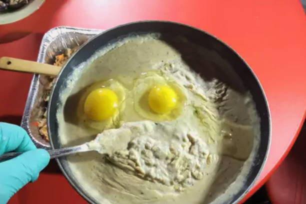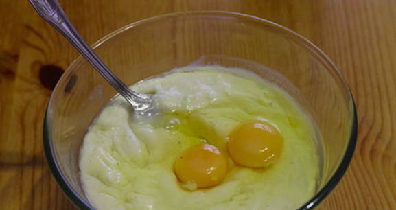 - Als de saus is afgekoeld, voeg je er eieren aan toe, meng je.