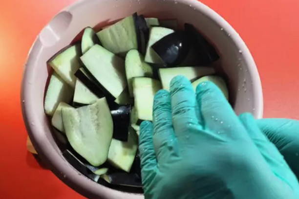 - Was de aubergines, snijd ze in reepjes en laat ze 20-30 minuten in gezouten water liggen.