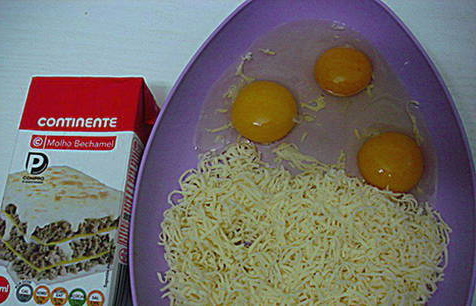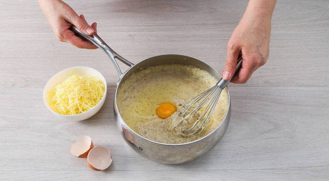 - Voeg eieren toe aan Bechamelsaus, meng ingrediënten.