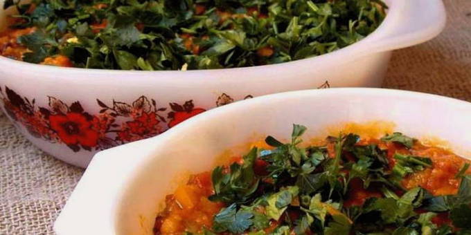 - Doe het resulterende mengsel in een ovenschaal, leg er een laag gebakken aubergine op, bestrooi met gehakte kruiden.